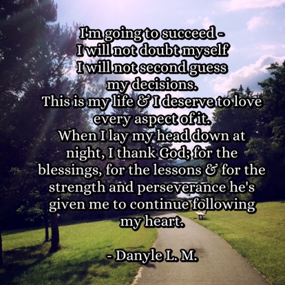 I’m going to succeed – I will not doubt myselfI will not second guess my decisions. This is my life & I deserve to love every aspect of it. When I lay my head down at night, I thank God; for the blessings, for the lessons & for the strength and perseverance he’s given me to continue following my heart. – Danyle L. M.